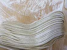 さて、打ってみた感触としましては、今回は配合九割蕎麦にて打ってみましたが・・・加水率は約43%程度の水を加えましたが結構柔らか目気味でした。蕎麦粉自体に含んでいる含水比率が高いためと思われますが、非常に打ちやすかったです。そばの打ち上がりの状態です。太めに切りましたので噛みしめながら「越前寒晒し蕎麦」の出来具合を楽しんでみたいと思います。